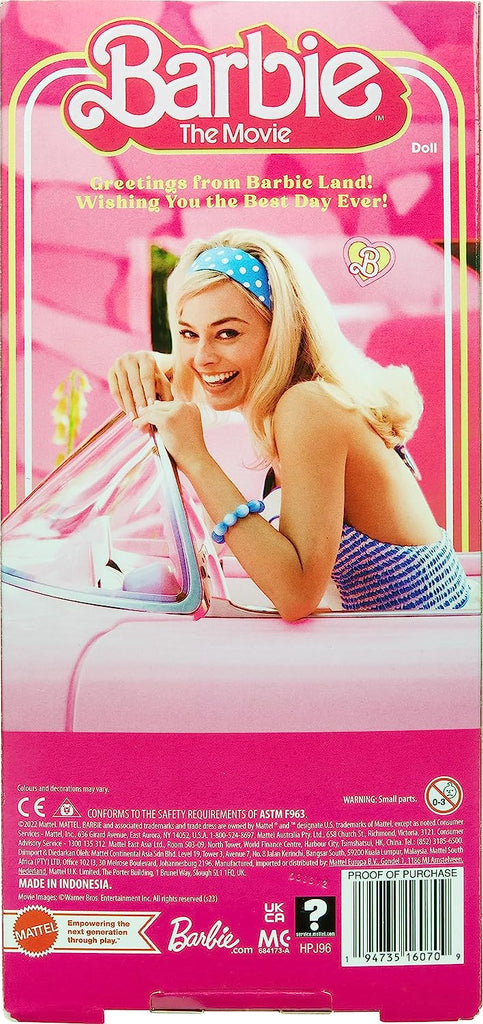 Greetings from Barbie Land! This Barbie doll cuts a timeless silhouette in a sweet dress modeled after one of her character’s iconic looks in Barbie The Movie. With her pink gingham dress, daisy necklace and pastel pumps, she’s ready to have the best day ever in Barbie Land! In the likeness of Margot Robbie as Barbie, this doll makes a great gift for fans and collectors alike. Doll cannot stand alone.