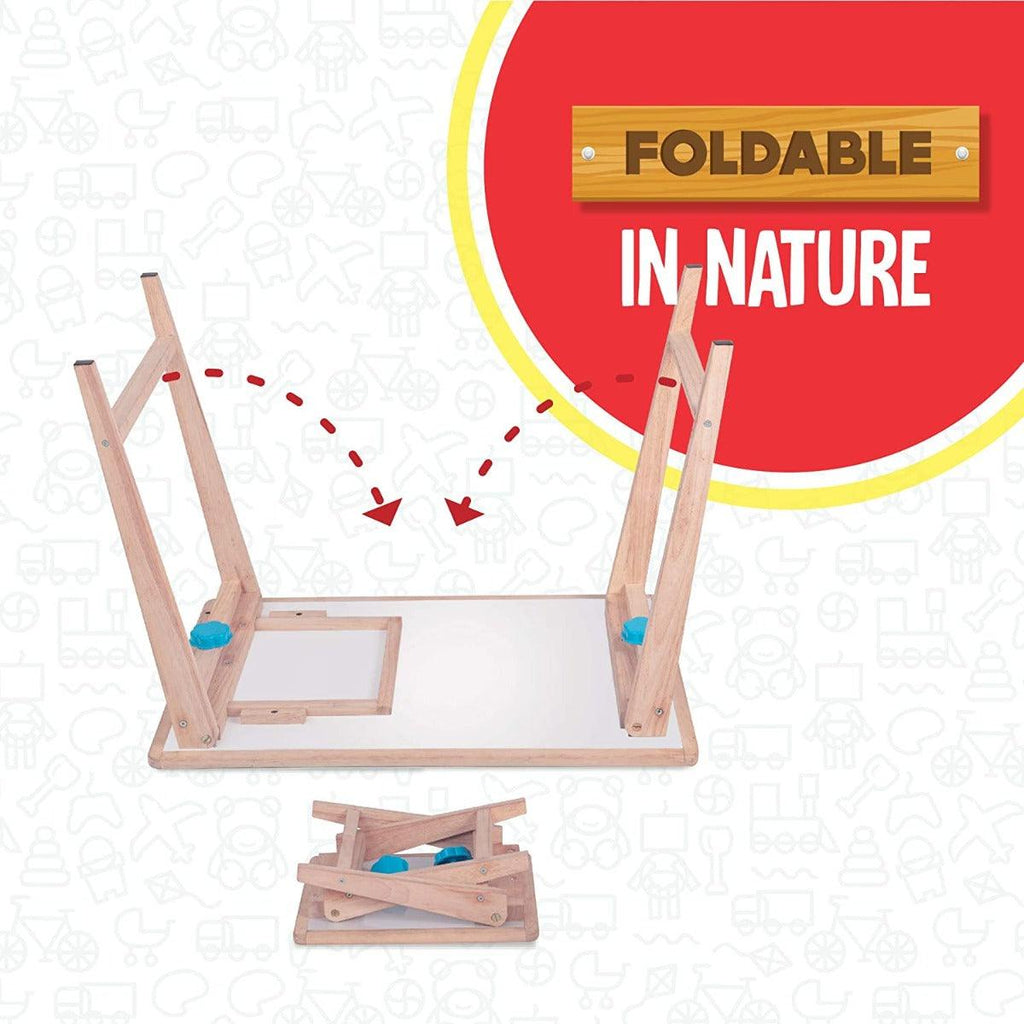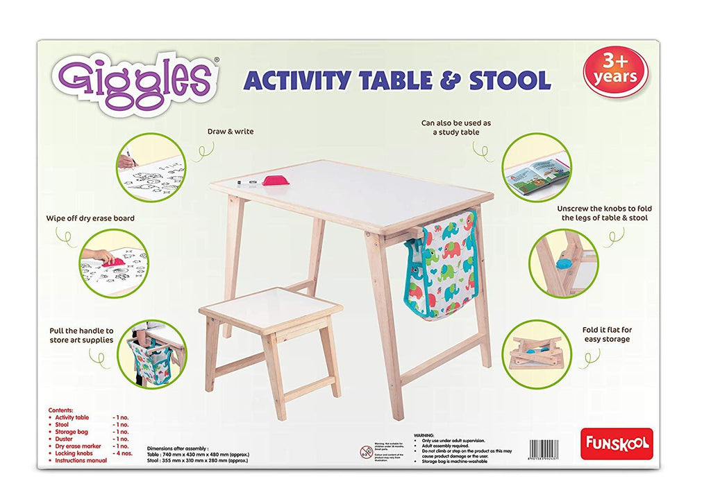 This activity table & stool set will be the highlight of your little one as its a multipurpose unit that can be used for a variety of purposes like studying, playing, creating, writing etc. It encourages their creativity and watch their imagination come to life! Simple and playful, your child will spend hours of imaginative fun and learning with the giggles activity table & stool. This set is amazingly designed with a storage bag to hold all the accessories without creating any mess. An added feature is that the storage bag is machine washable. Both the activity table & stool can be easily folded when not in use by unscrewing the knobs. Please make sure you store the knobs in a safe place. The white board on the table will keep your children preoccupied for hours and hours as they explore and create by drawing, writing, playing etc. Dimensions after assembly: activity table – 740x430x480mm (approximately) & stool – 355x310x280 mm (approximately)